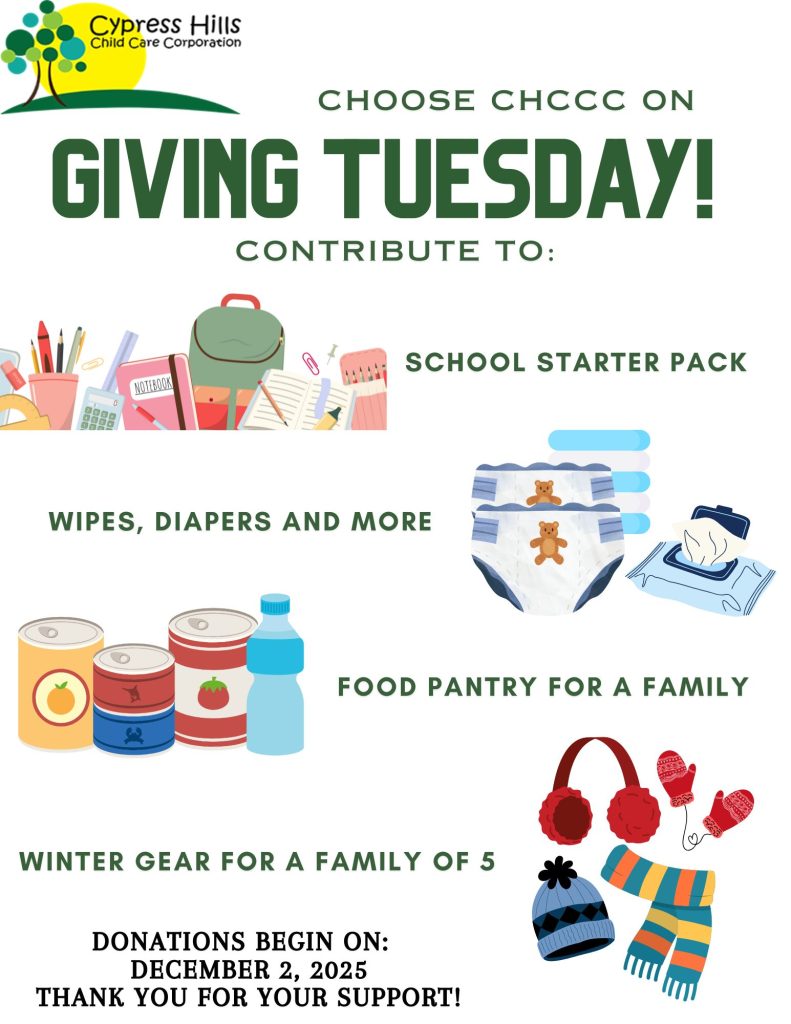 Thank you for supporting Cypress Hills Child Care Corporation! Your financial contribution of any amount will make a real difference in the lives of children and their families. All donations are fully tax deductible as we are a tax exempt 501 (c)(3) organization.